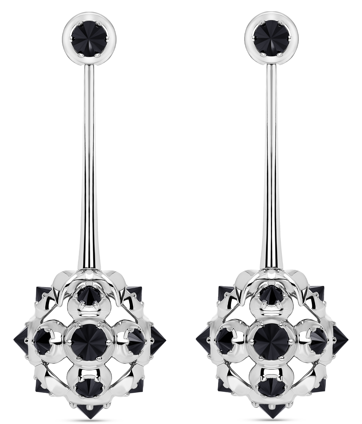 Длинные серьги в виде ягодки ежевики на стебельке. Визуальная массивность гармонично сочетается с изяществом исполнения, а фактурный дизайн гармонично дополняет оригинальная вставка камней: черные бриллианты в сферическом закрепе. Это придает объем камням и сложную форму изделию.