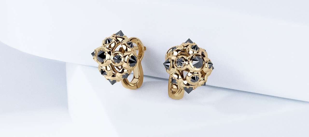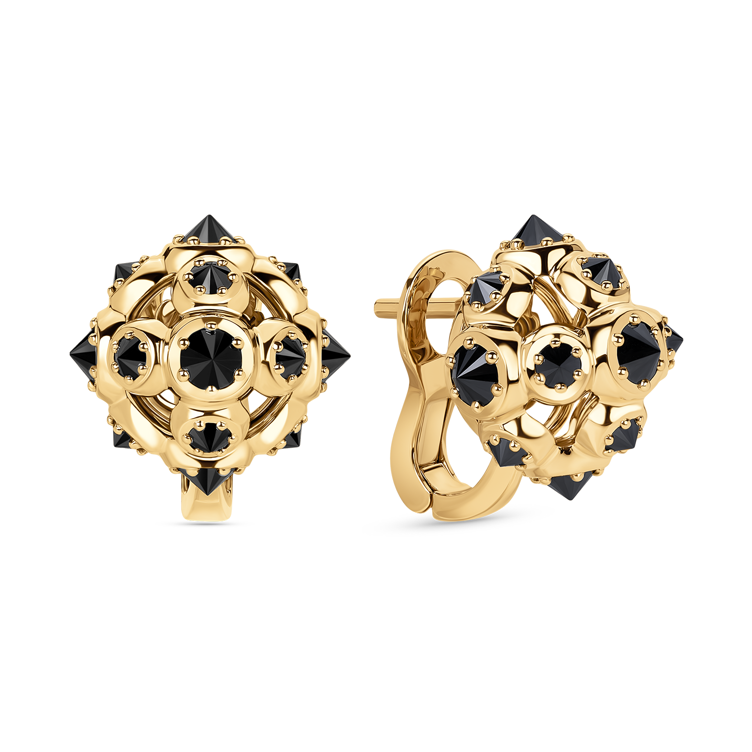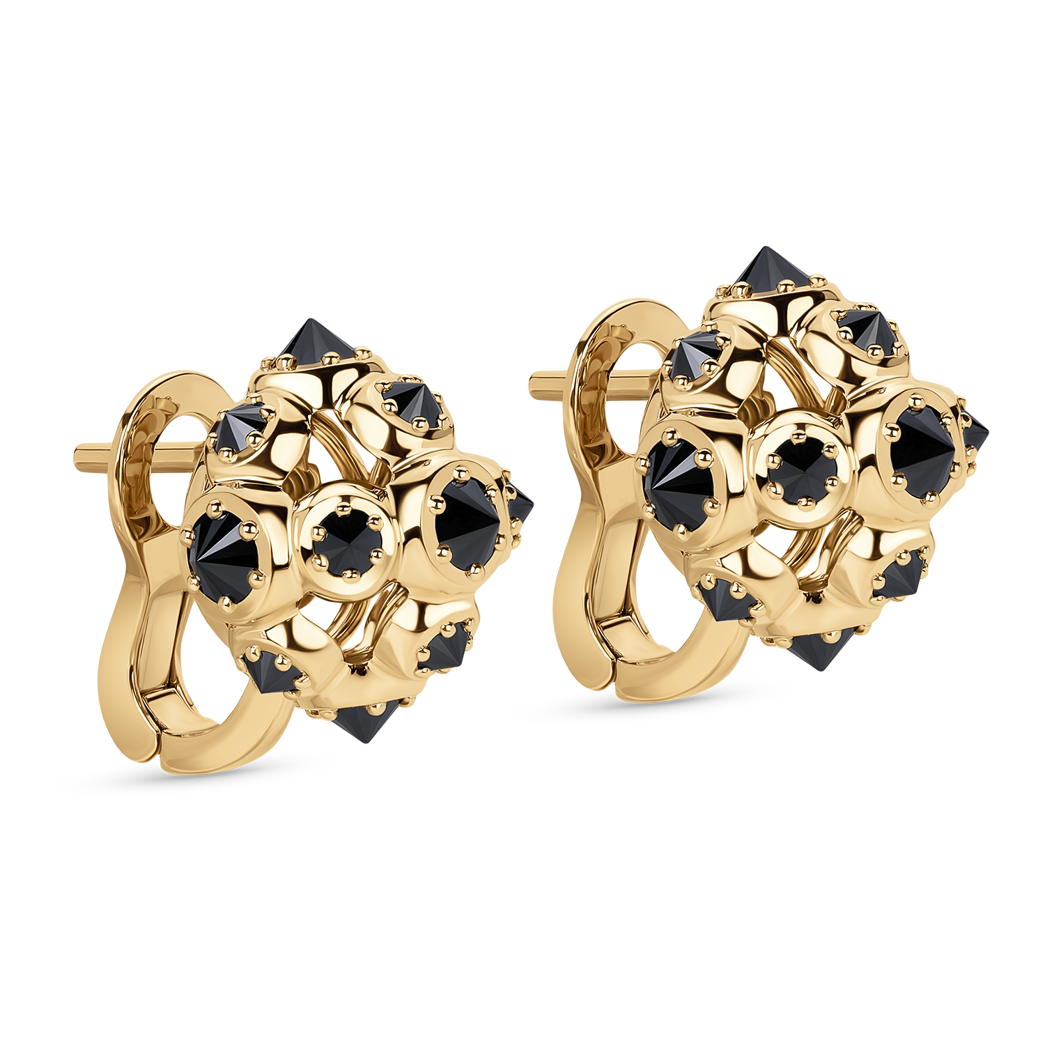 Серьги «Ежевика» из желтого золота 750 пробы с черными бриллиантами. Коллекция «Сказочный лес».