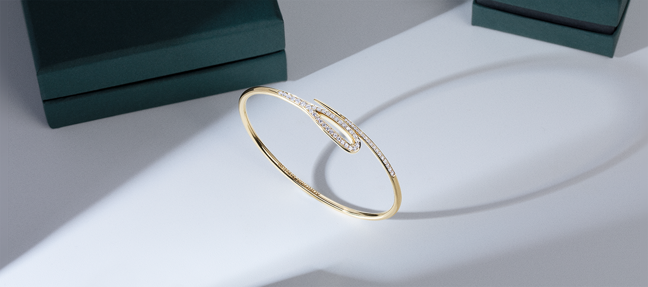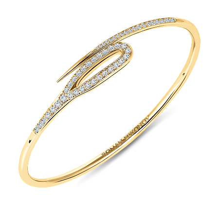 Изящный браслет «Кащеева игла» из желтого золота инкрустированный бриллиантовой дорожкой в технике паве (half pave). Браслет утонченно повторяет линию запястья. Завораживающая динамика, сияние бриллиантов и нежный блеск золота: все это сплелось в единую композицию.