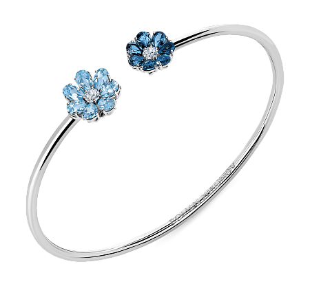 Нежный гибкий браслет из 18-ти каратного белого золота с двумя волшебными цветками с топазами London, Swiss и бриллиантами в центре. Яркие лепестки цветика огранки «груша». Сердцевина цветка украшена бриллиантом классической огранки. Преимущество браслета в его утонченной, гибкой форме, благодаря которой украшение легко надевать. Браслет изящно смотрится на запястье, а игра света подчеркивает яркий колорит драгоценных лепестков.