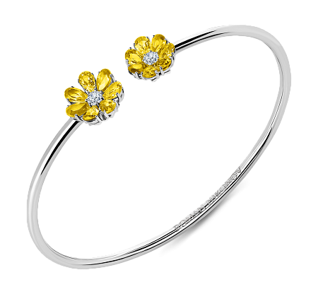 Нежный гибкий браслет из 18-ти каратного белого золота с двумя волшебными цветками в центре. Яркие лепестки цветика из цитрина огранки «груша». Сердцевина цветка украшена бриллиантом классической огранки. Преимущество браслета в его утонченной, гибкой форме, благодаря которой украшение легко надевать. Браслет изящно смотрится на запястье, а игра света подчеркивает яркий колорит драгоценных лепестков.