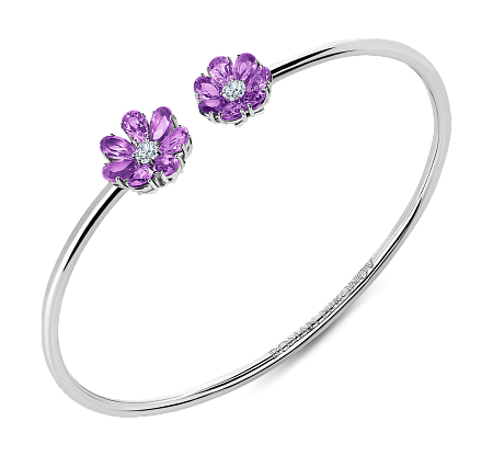 Нежный гибкий браслет из 18-ти каратного белого золота с двумя волшебными цветками в центре. Яркие лепестки цветика из аметистов огранки «груша». Сердцевина цветка украшена бриллиантом классической огранки. Преимущество браслета в его утонченной, гибкой форме, благодаря которой украшение легко надевать. Браслет изящно смотрится на запястье, а игра света подчеркивает яркий колорит драгоценных лепестков.