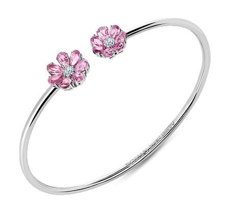 Нежный гибкий браслет из 18-ти каратного белого золота с двумя волшебными цветками в центре. Яркие лепестки цветика из топазов огранки «груша». Сердцевина цветка украшена бриллиантом классической огранки. Преимущество браслета в его утонченной, гибкой форме, благодаря которой украшение легко надевать. Браслет изящно смотрится на запястье, а игра света подчеркивает яркий колорит драгоценных лепестков.