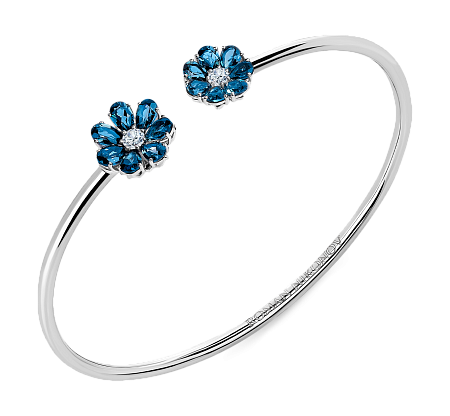 Нежный гибкий браслет из 18-ти каратного белого золота с двумя волшебными цветками с топазами London и бриллиантами в центре. Яркие лепестки цветика огранки «груша». Сердцевина цветка украшена бриллиантом классической огранки. Преимущество браслета в его утонченной, гибкой форме, благодаря которой украшение легко надевать. Браслет изящно смотрится на запястье, а игра света подчеркивает яркий колорит драгоценных лепестков.