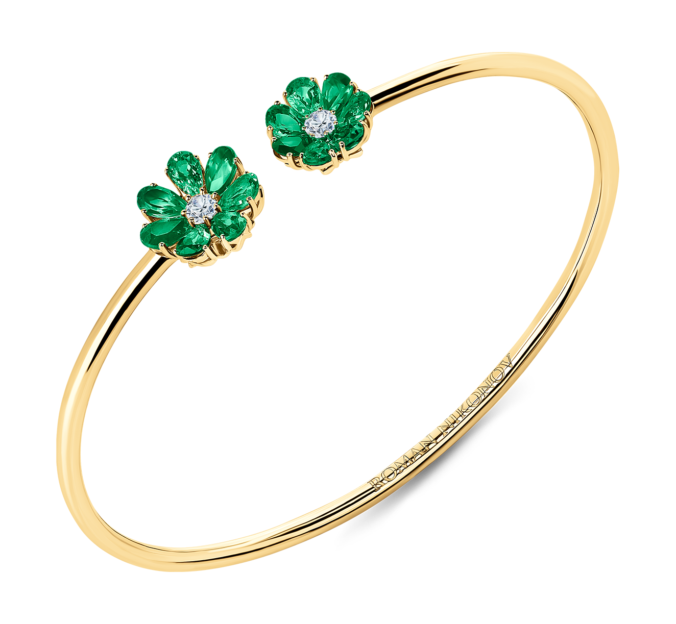 Нежный гибкий браслет из 18-ти каратного желтого золота с двумя волшебными цветками в центре. Яркие лепестки цветика из изумрудов огранки «груша». Сердцевина цветка украшена бриллиантом классической огранки. Преимущество браслета в его утонченной, гибкой форме, благодаря которой украшение легко надевать. Браслет изящно смотрится на запястье, а игра света подчеркивает яркий колорит драгоценных лепестков.