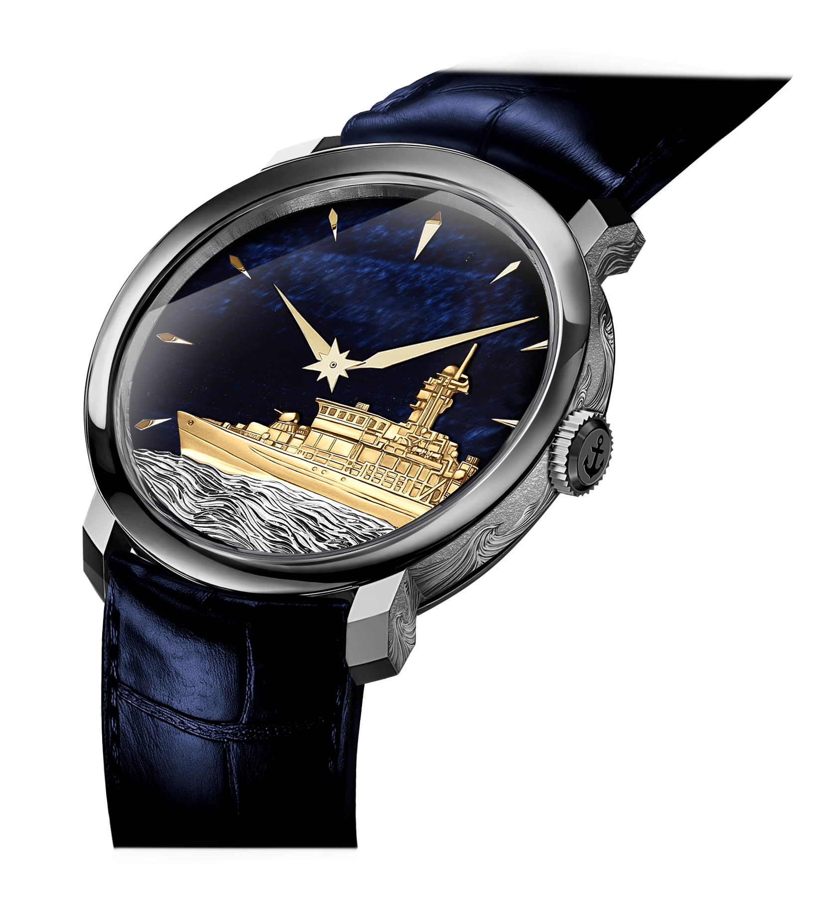 Дополняет фактуру рельефный рисунок якоря, символа опоры и верности курсу. Гравировка – настоящее декоративное искусство. Мастер-гравер, используя тщательно подобранный набор инструментов, вручную под микроскопом вырезает изысканные рисунки на самых благородных материалах. С высокой точностью он создает рельеф на поверхности, действуя с невероятной осторожностью и терпением, ведь малейшее неверное движение может разрушить результат многодневного труда.