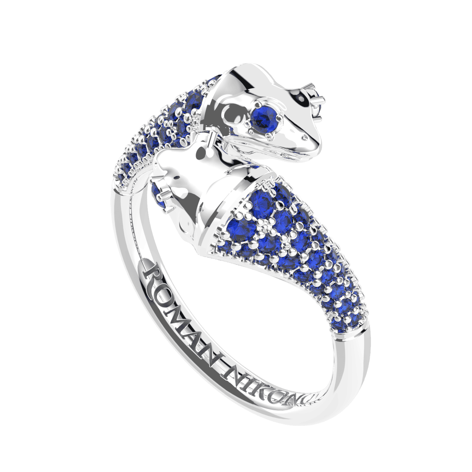 Кольцо с необычным дизайном: смыкающиеся в центре головы лягушек. Спинка каждой покрыта сапфировым паве, глаза – сапфиры.