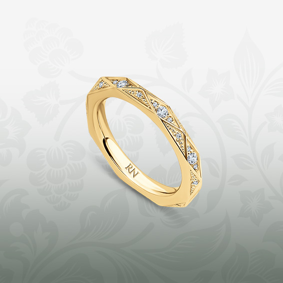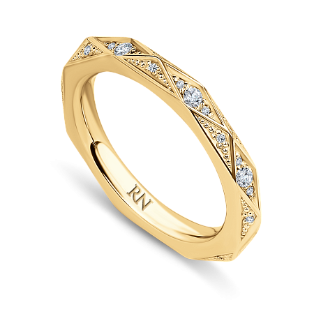Элегантное женское обручальное кольцо из желтого золота имеет геометричную текстуру с гранями. Изысканная инкрустация бриллиантами разных размеров классической огранки. Крапаны используются как закрепки бриллиантов и в декоре. Изделие сочетает в себе элементы непревзойденной классики и сложную геометрию дизайна.