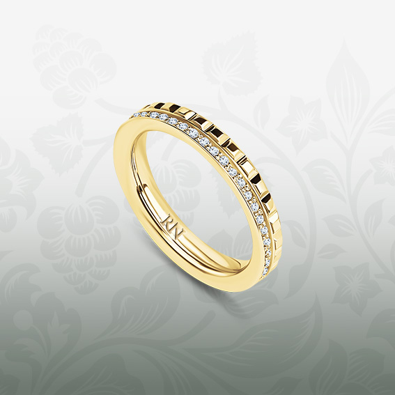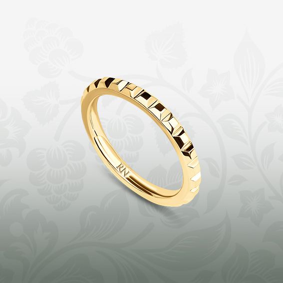 Обручальное кольцо с графичным узором без вставок. Узкая шинка. Изделие сочетает в себе элементы непревзойденной классики и сложную геометрию дизайна.