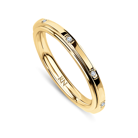 Полновесное обручальное кольцо имеет геометричную текстуру. Глянцевая двухуровневая шинка имитирует кольца Сатурна. Инкрустация бриллиантами по кругу. Изделие сочетает в себе элементы непревзойденной классики и сложную геометрию дизайна.