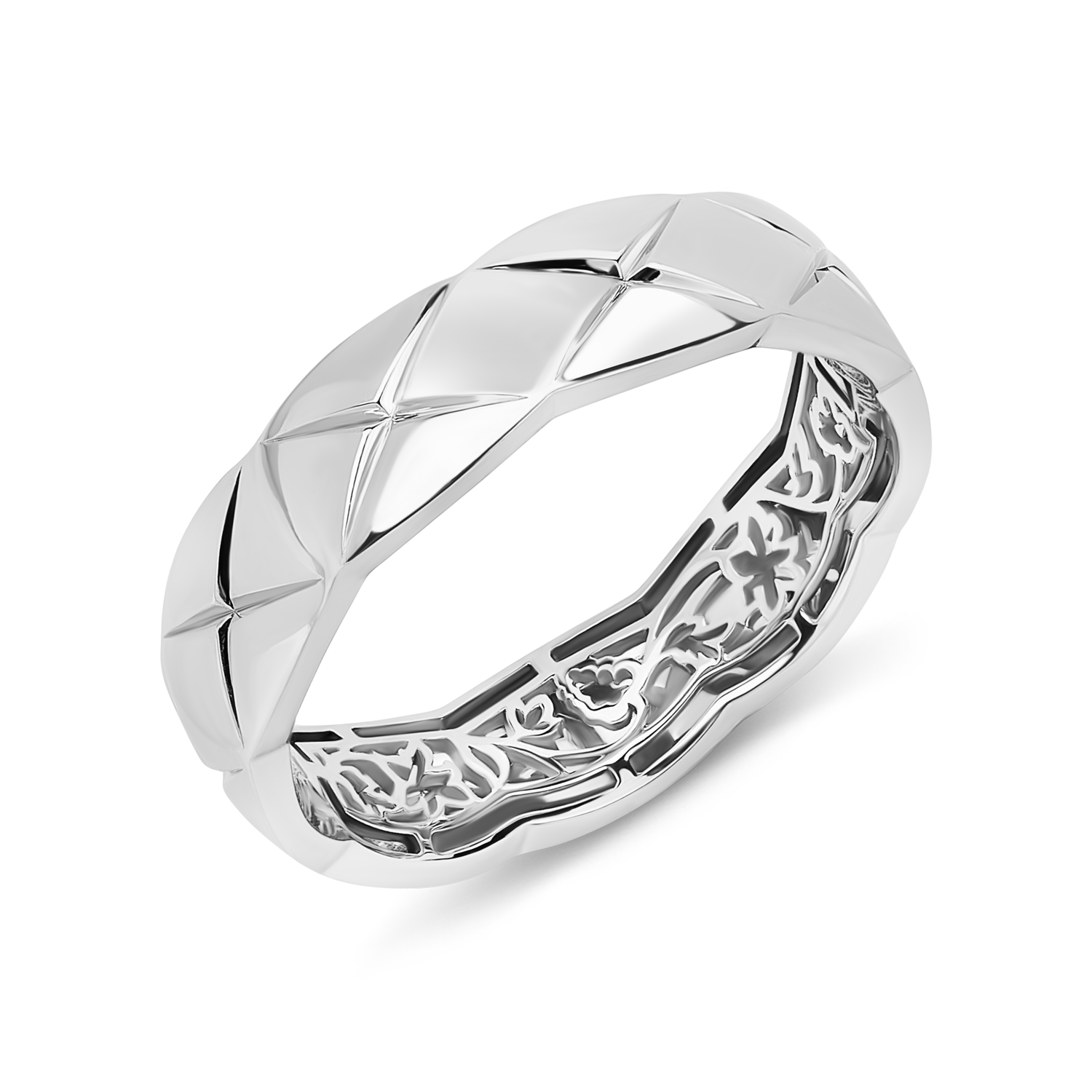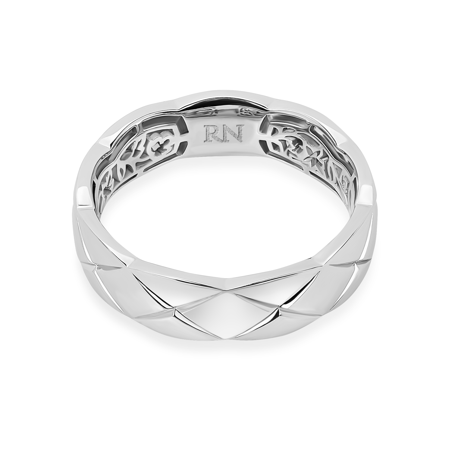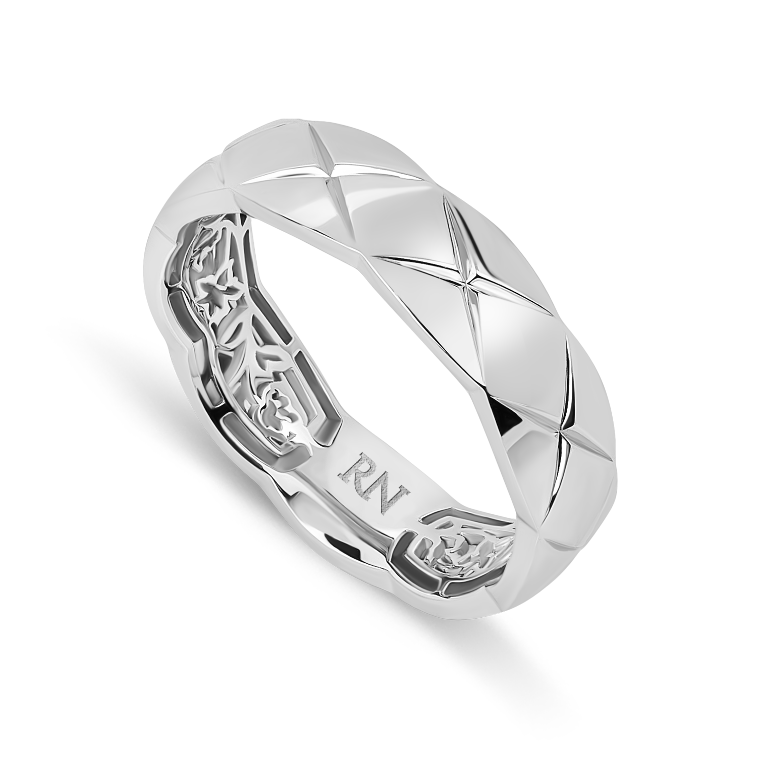 Обручальное полновесное кольцо из белого золота с объемной текстурой и стеганым узором без вставок.