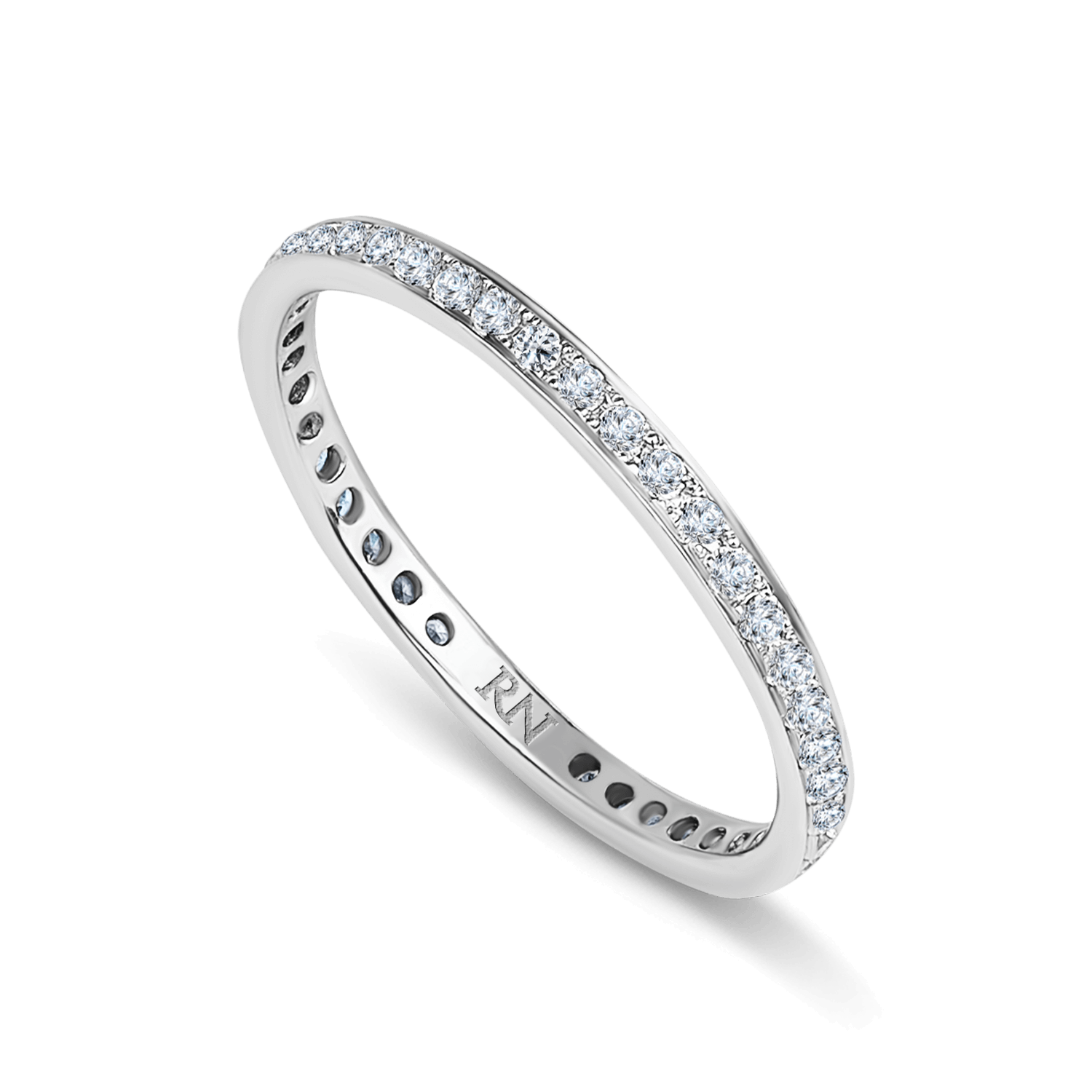 Обручальное кольцо с узкой шинкой инкрустировано дорожкой бриллиантов классической огранки по кругу. Изделие сочетает в себе элементы непревзойденной классики и геометрию современного дизайна.