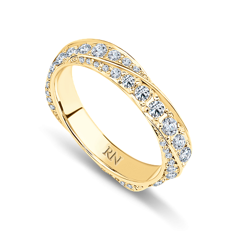 Элегантное женское обручальное кольцо из желтого золота с бриллиантовыми дорожками. Шинка сложной спиралевидной формы. Изысканная инкрустация бриллиантами разных размеров классической огранки.