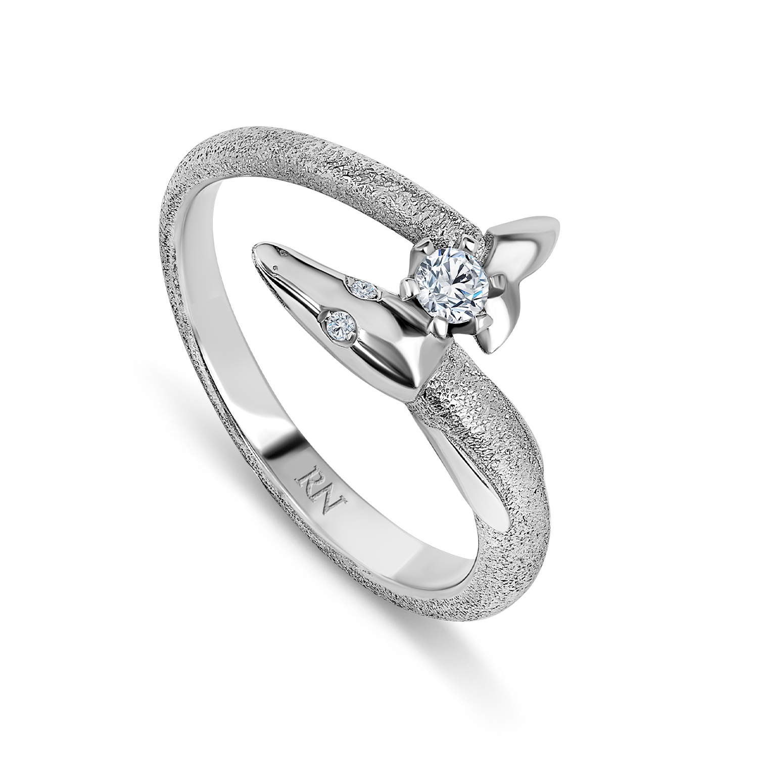 Авторское серебряное кольцо в виде волшебной щуки. Шинка текстурной поверхности, имитирующей искристую мелкую гладкую чешую. На центральной части игриво встречаются глянцевые хвост и голова щуки. Искристые загадочные глазки выполнены бриллиантами. Корону венчает бриллиант классической огранки.