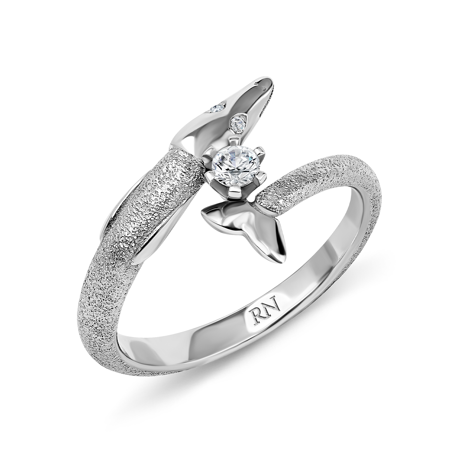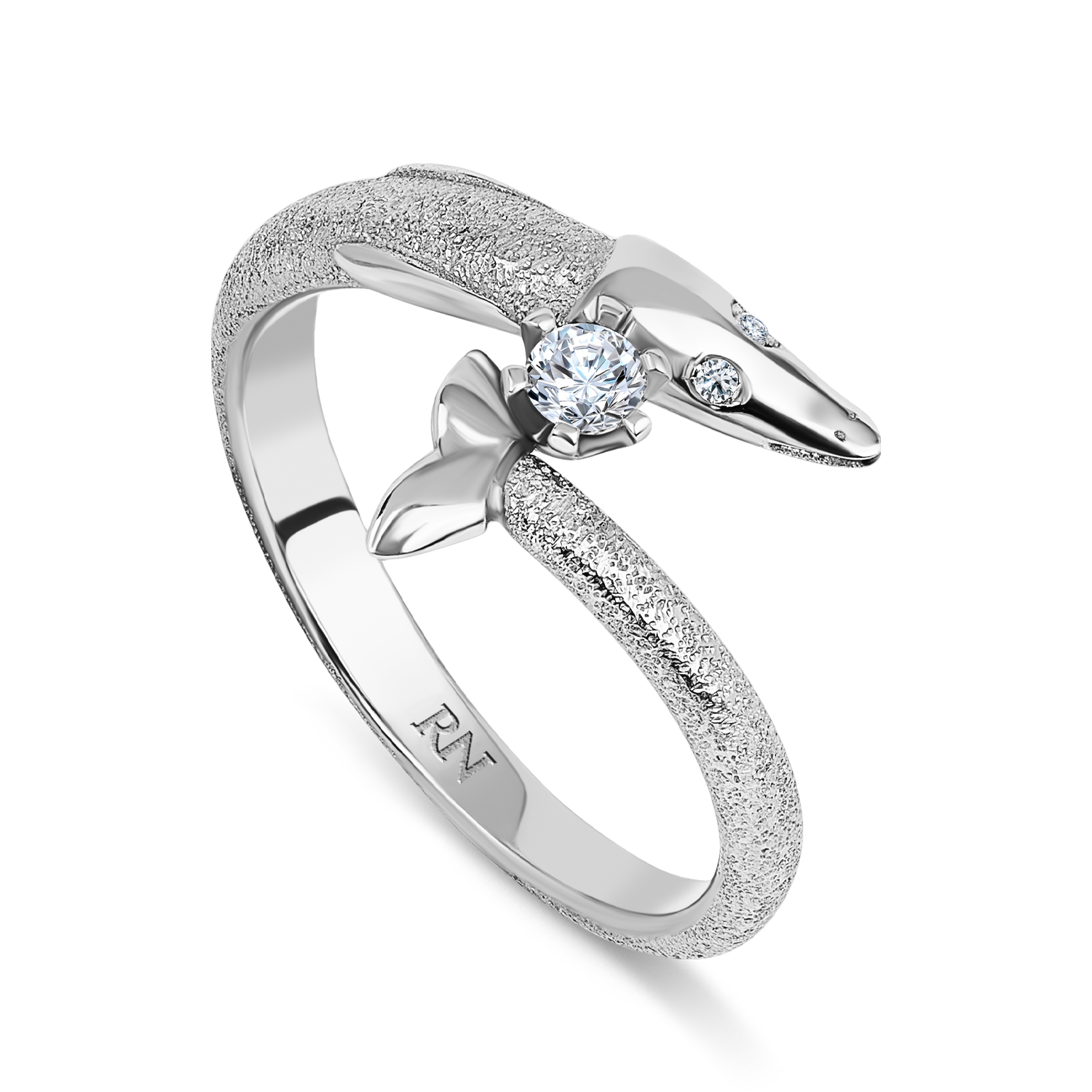 Шинка текстурной поверхности, имитирующей искристую мелкую гладкую чешую. На центральной части игриво встречаются глянцевые хвост и голова щуки. Искристые загадочные глазки выполнены бриллиантами. Корону венчает бриллиант классической огранки.