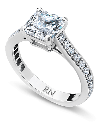 Роскошное кольцо для предложения, инкрустированное центральным крупным бриллиантом огранки «Принцесса» и дорожкой бриллиантов по шинке.