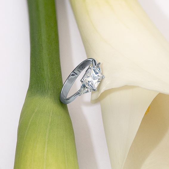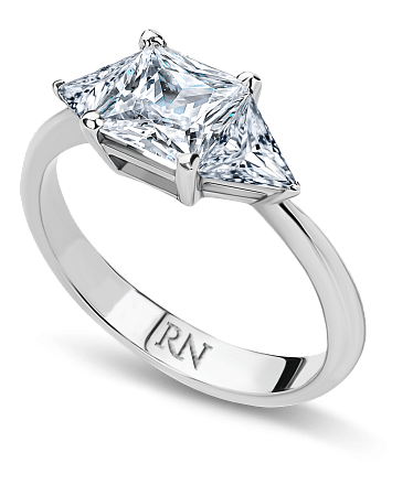 Помолвочное кольцо с 3 бриллиантами: центральным бриллиантом огранки «Принцесса» и двумя бриллиантами по бокам. Роскошное кольцо для предложения с узкой глянцевой шинкой.