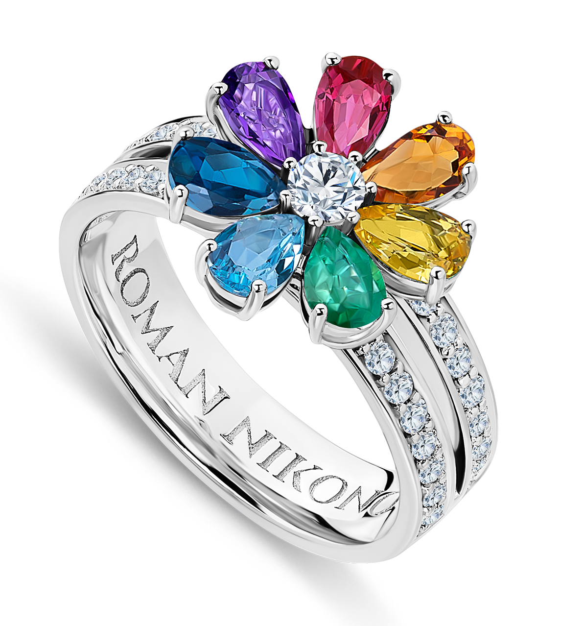 Кольцо из белого золота с широкой шинкой, украшенной двумя дорожками натуральных бриллиантов. Центральный элемент кольца – цветик-семицветик. 7 лепестков украшены камнями цветов радуги, в центре – бриллиант.