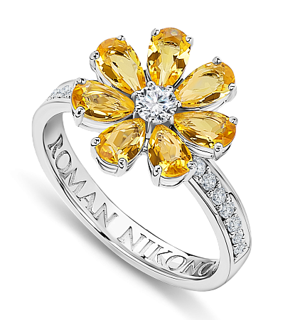 Кольцо «Цветик» из белого золота 750 пробы с цитринами и бриллиантами. Коллекция «Сказки».