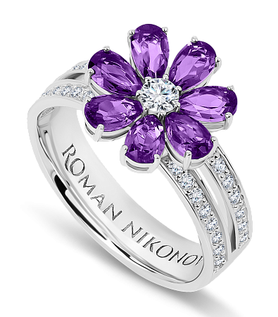 Кольцо и белого золота с широкой шинкой, украшенной бриллиантовой дорожкой. Центральный элемент – цветик с 7 лепестками – аметисты огранки «груша», сердцевина цветика – бриллиант классической огранки.