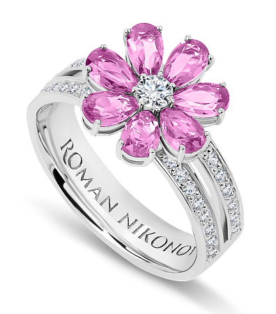 Кольцо и белого золота с широкой шинкой, украшенной бриллиантовой дорожкой. Центральный элемент – цветик с 7 лепестками – розовые топазы огранки «груша», сердцевина цветика – бриллиант классической огранки.