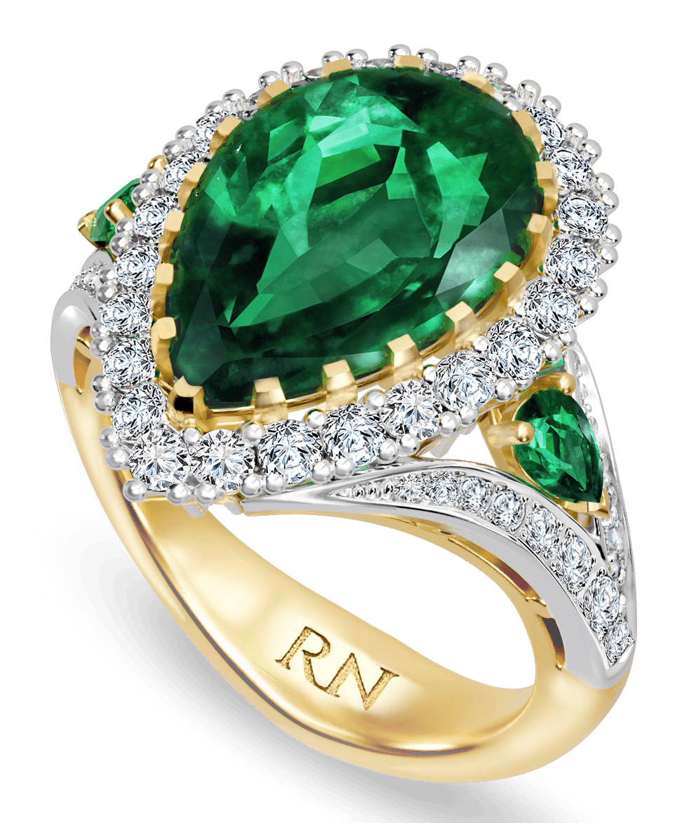 Роскошное кольцо, инкрустированное россыпью бриллиантов с яркими изумрудами классической огранки "груша" в центре и у основания украшения.