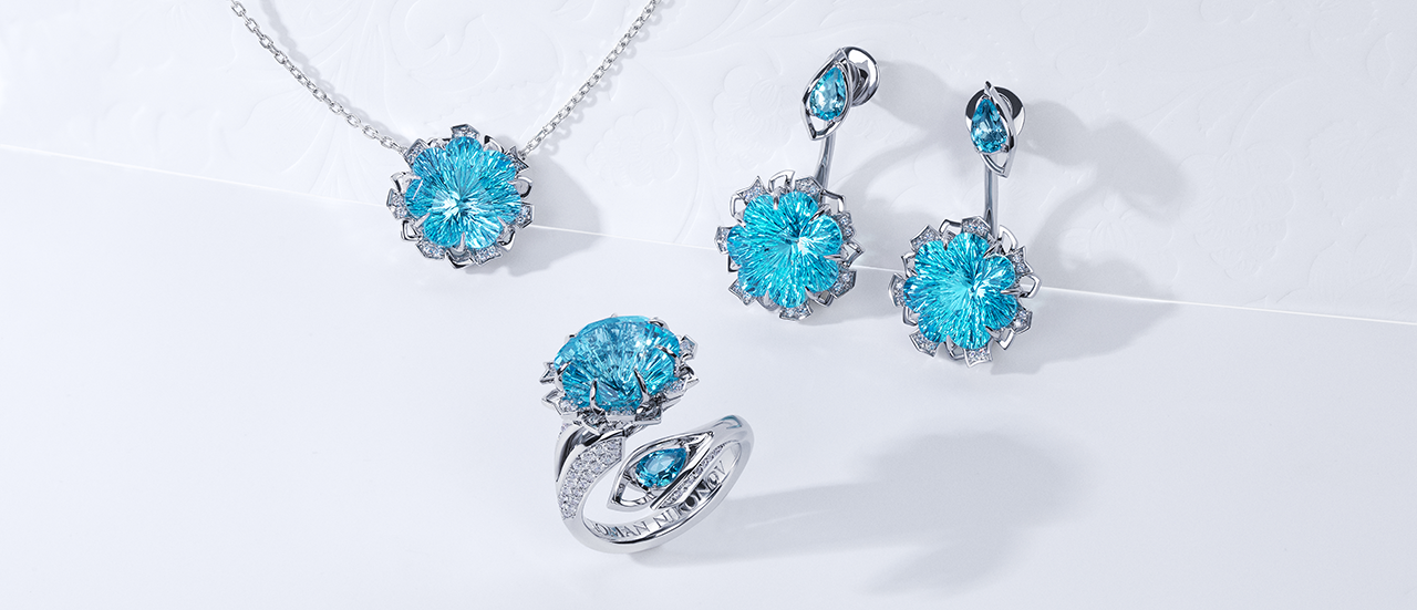Для закрепления и огранки центрального топаза в форме семи лепестков было специально разработано и изготовлено эксклюзивное приспособление. Результат – уникальная «калейдоскопическая» огранка. Подгонка такого камня в оправу и его закрепка требуют высочайшего мастерства и выполняются исключительно вручную.