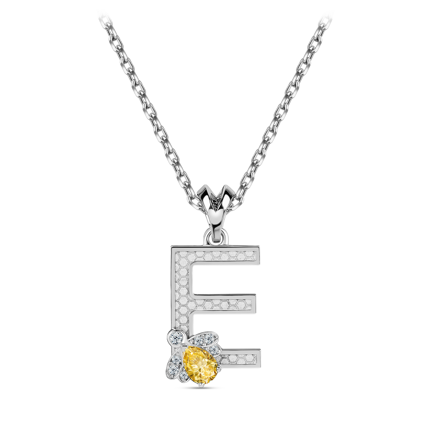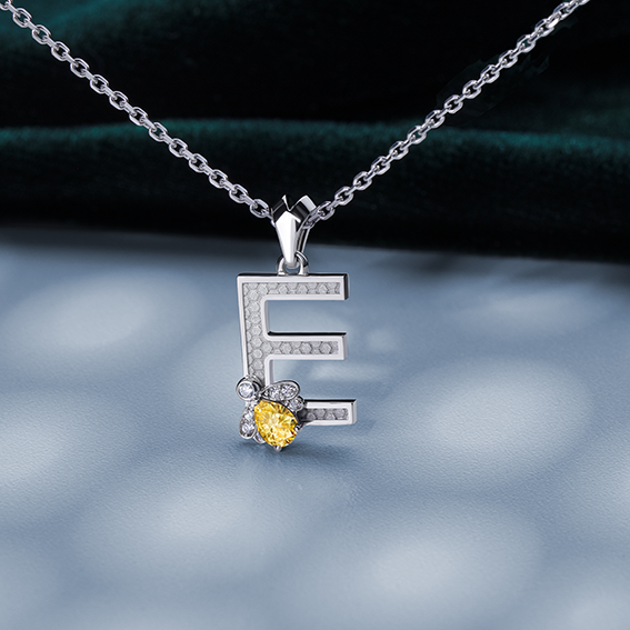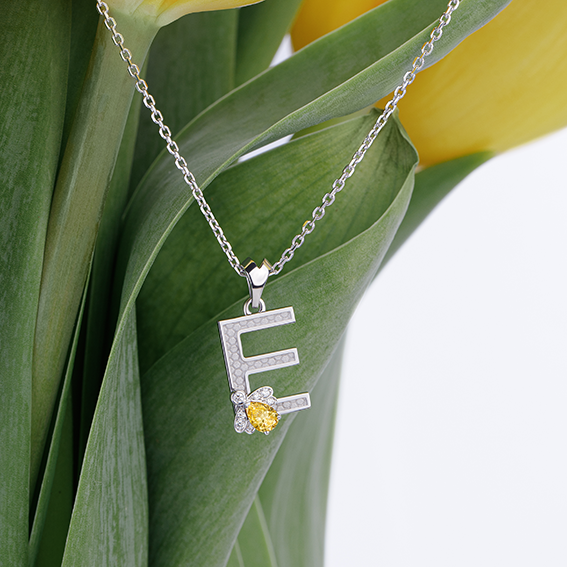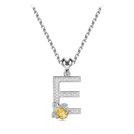 Выразительная подвеска с изящной буквой Е украшена волшебной пчелой. Ее крылья сияют россыпью бриллиантов, а солнечный цитрин на спинке притягивает взгляды теплым медовым светом.