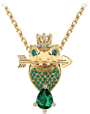 Подвеска в виде лягушки в бриллиантовой короне. В лапках лягушка держит крупный изумруд огранки «груша», во рту – драгоценную стрелу. Тело лягушки покрыто изумрудным паве.