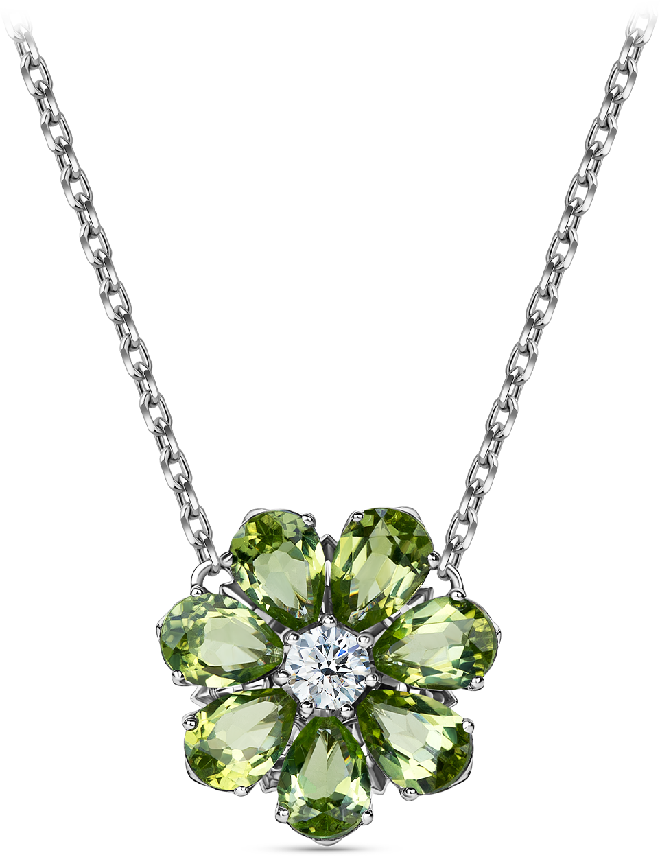 Подвеска в виде цветка с 7 лепестками – хризолиты огранки «груша», в центре – бриллиант классической огранки.