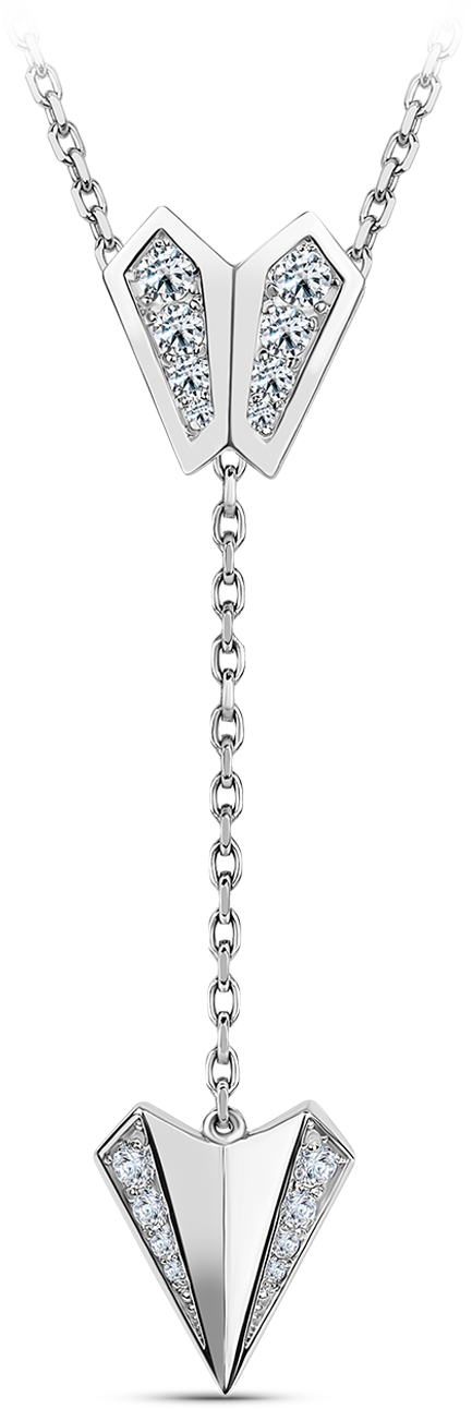 Нежная подвеска с утонченным ювелирным дизайном покоряют сердце с первого взгляда! Стрелы выполнены в виде геометрического сердца, часть граней которого инкрустированы бриллиантами, часть – глянцевое белое золото без вставок. Стержень из воздушных звеньев буквально струится в воздухе.