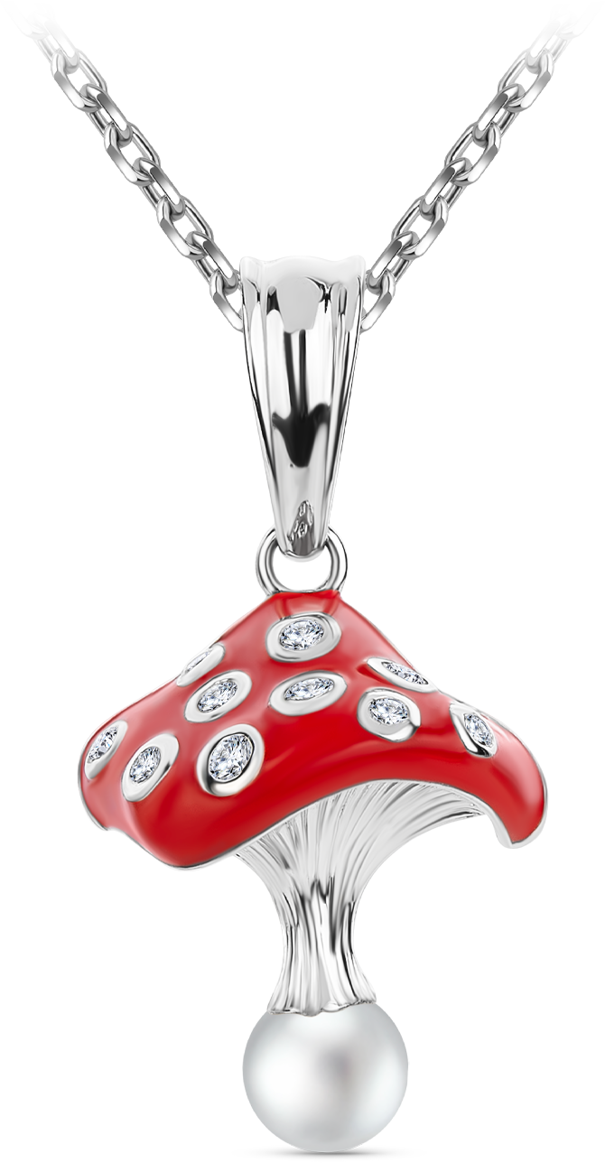Очаровательная подвеска в форме объемного грибочка-мухомора. Шапка покрыта сочной красной эмалью и вставками ослепительных бриллиантов. Золотая ножка имеет фактуру и завершается нежной жемчужиной.