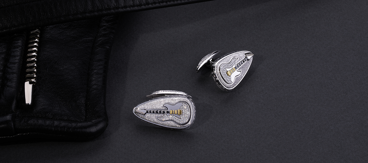 Исключительные запонки с изящной гитарой в сочетании белого и желтого золота 750 пробы, инкрустированные 242-мя белыми и 14-ю черными бриллиантами!