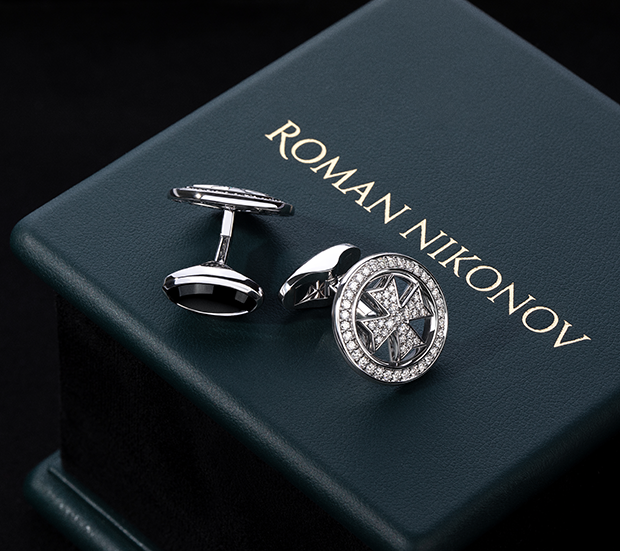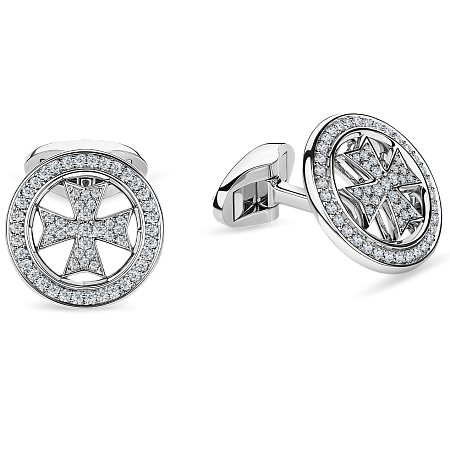 Запонки «Мальтийский крест» из белого золота 750 пробы, инкрустированные бриллиантами и ониксом.